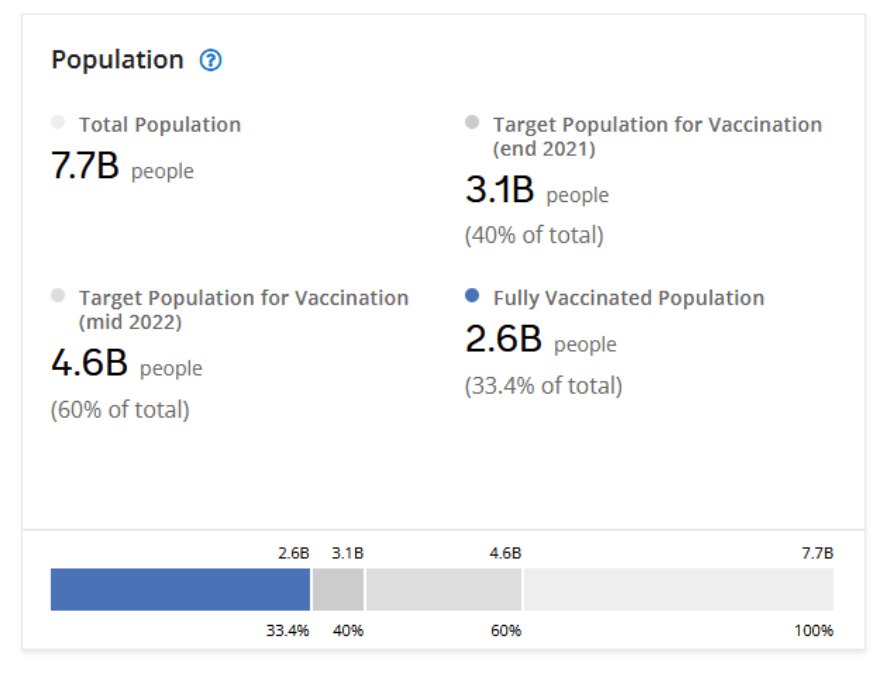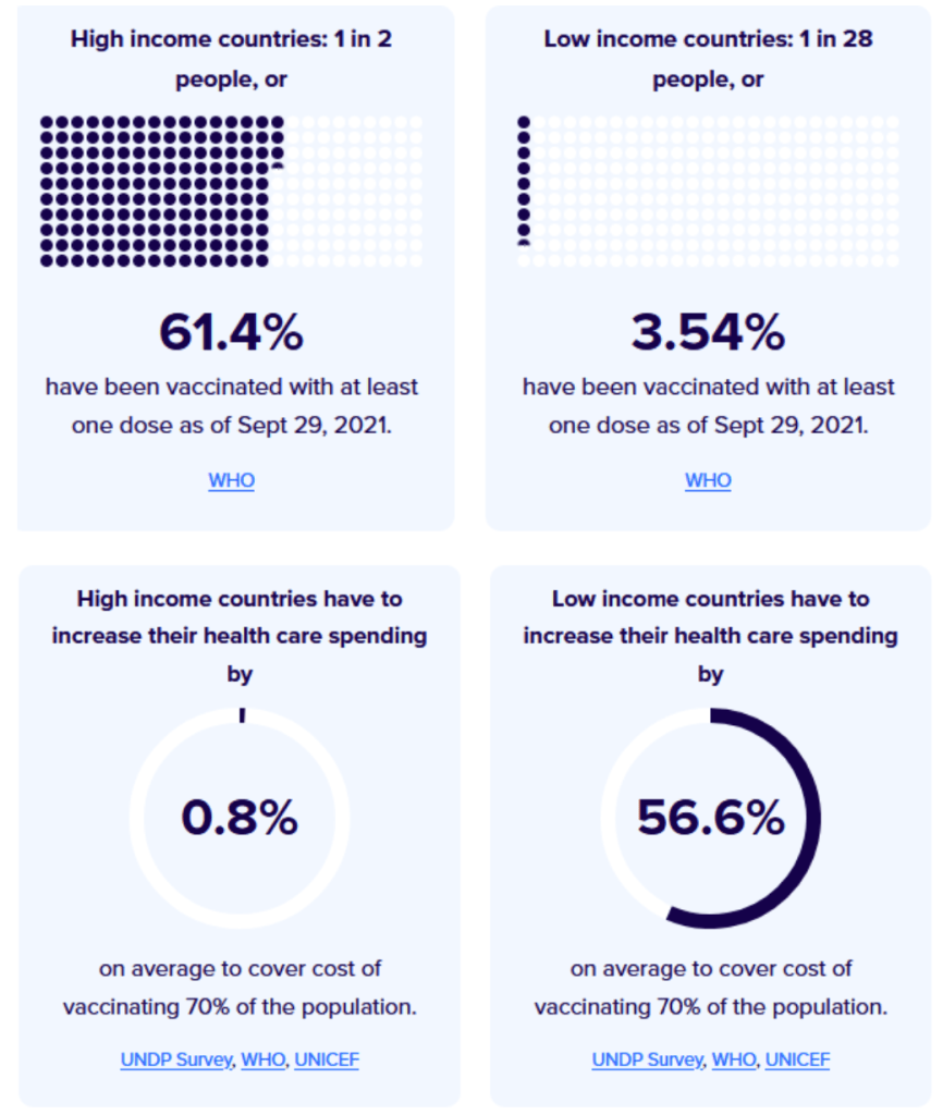 The global goal of fully vaccinating 10% of every country’s population by 30 September was set in May by the World Health Assembly, the world’s highest health policy-setting body. Almost 90% of high income-countries have met this target.