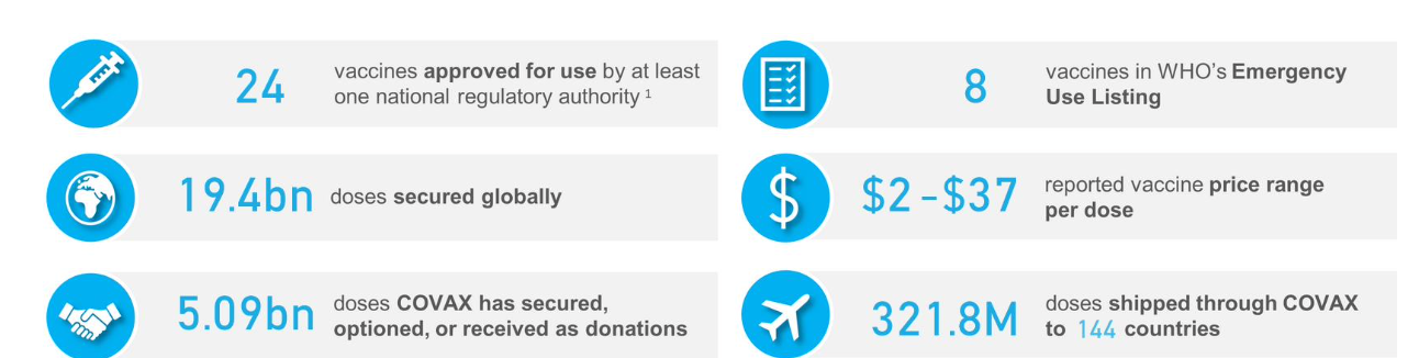 Ending the pandemic will require the world to shift its focus to equitably deploying and optimizing the use of vaccines now being produced at scale. In the second half of 2021, with a number of COVID-19 vaccines being produced, the focus must shift to equitable vaccine deployment and optimum use based on safety and effectiveness data.