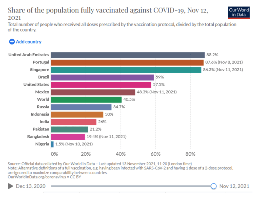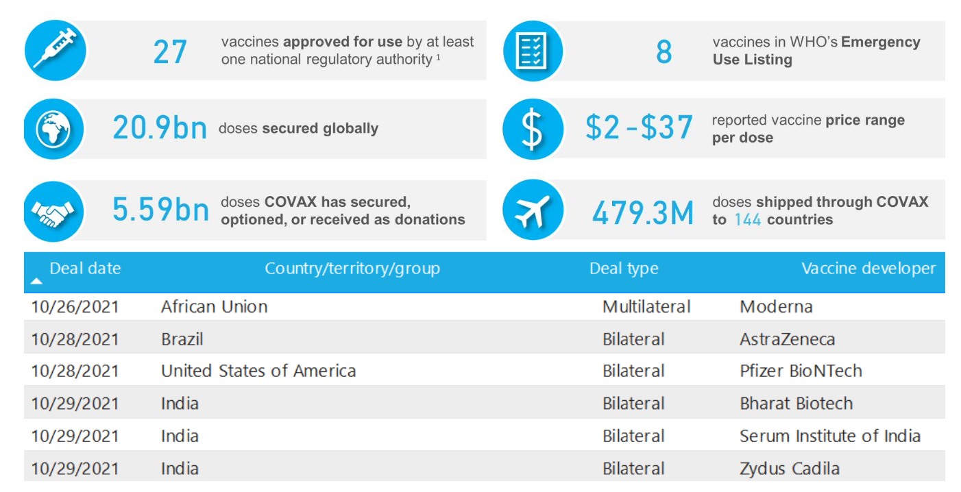 The heads of the International Monetary Fund, World Bank Group, World Health Organization and World Trade Organization held on 9 November the 2nd High-Level Consultations with the CEOs of leading COVID-19 vaccine manufacturing companies. At the meeting, all participants agreed on the urgency of delivering more vaccine doses to low-income countries, where less than 2.5% of the population has been fully vaccinated.