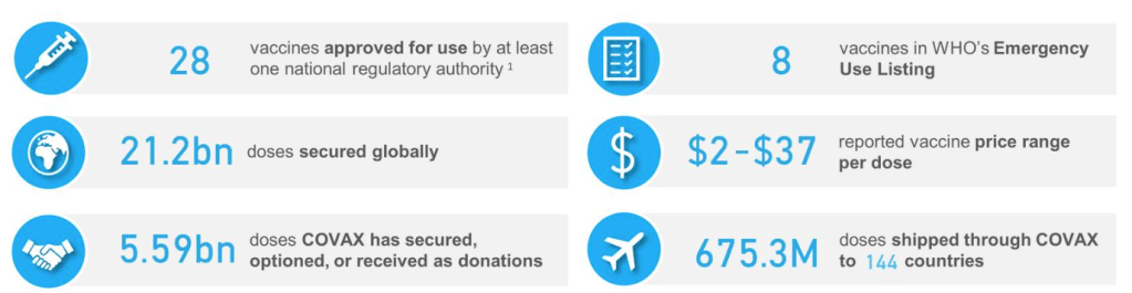 Since the World Health Organization’s declaration of the pandemic in March 2020, remarkable advances in health product development have made a significant impact against COVID-19. These advances include the development and marketing of several new testing devices, numerous disinfectants and sanitizers, different types of personal protective equipment, a variety of products to assist patients in hospitals and intensive care units (ICU), some new treatments, and a number of new vaccines. While several vaccines have been successfully brought to market and are currently being deployed globally, with several others under development, more efforts are needed to increase the availability of and access to effective treatments across the disease spectrum.