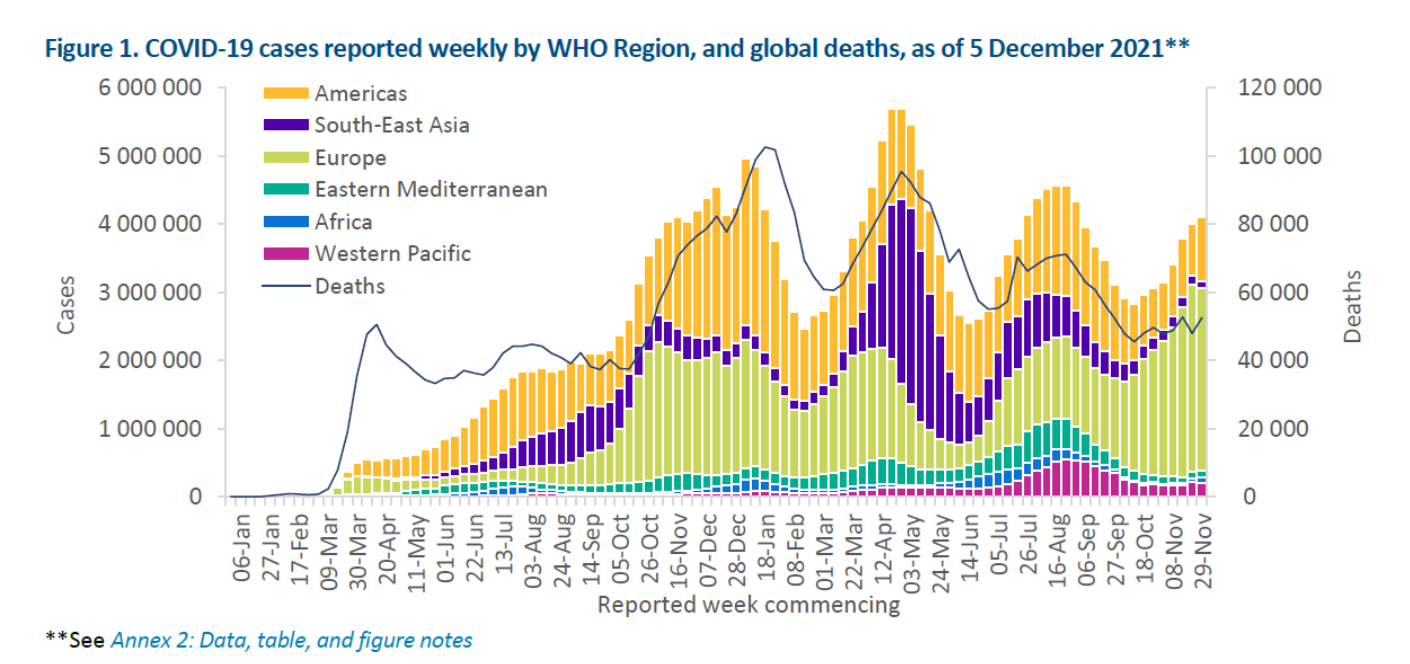 Globally, weekly COVID-19 case incidence plateaued this week (29 November – 5 December 2021), with over 4 million confirmed new cases reported, similar to the number reported in the previous week’s figures. However, new weekly deaths increased by 10% as compared to the previous week, with over 52 500 new deaths reported. As of 5 December, nearly 265 million confirmed cases and over 5.2 million deaths have been reported globally.
