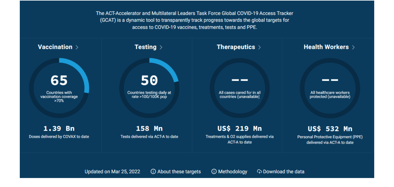 COVID-19 Global Targets and Progress Tracker – IMF The COVID-19 Global Targets and Progress Tracker presents a consolidated view of the progress towards global COVID-19 targets, barriers in access to COVID-19 tools, and delivery of donor pledges.