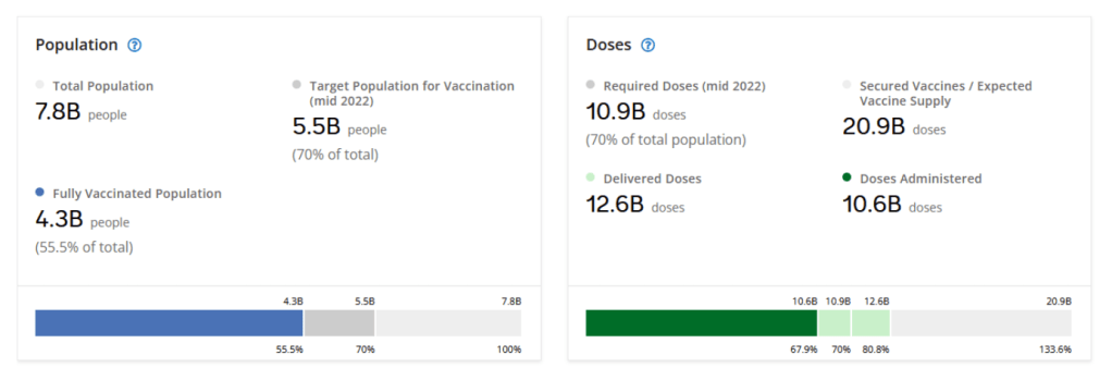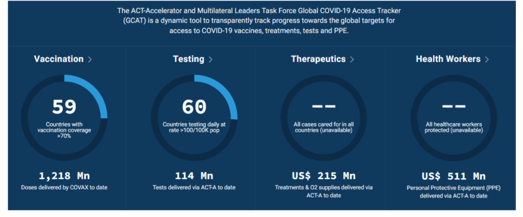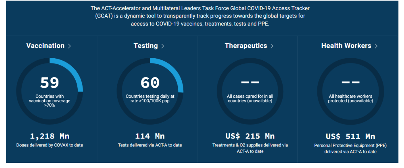 The COVID-19 Global Targets and Progress Tracker presents a consolidated view of the progress towards global COVID-19 targets, barriers in access to COVID-19 tools, and delivery of donor pledges. The global targets presented in the Tracker are based on an alignment of the targets identified in the IMF Pandemic Proposal, ACT-A Strategic Plan & Budget, and the US-hosted Global C19 Summit, and as such have been reaffirmed by multilateral institutions and global leaders. We will continue to enhance the tracker as we improve our data collection efforts.