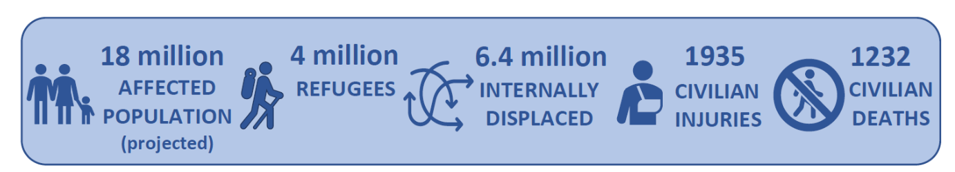 “…Vaccination for COVID-19 has been disrupted. Prior to the conflict at least 50 000 people per day were receiving vaccination. This number has dropped significantly, with only 175 000 people being vaccinated between 24 February and 15 March despite suboptimal vaccination coverage. Between 23 February and 30 March, the overall number of beds available and beds occupied by patients with COVID-19 has decreased by 29% and 85% respectively, reflecting potential challenges in accessing hospitals, limited data reporting, and a potential decrease in actual hospitalizations following the peak of the Omicron wave earlier in February…