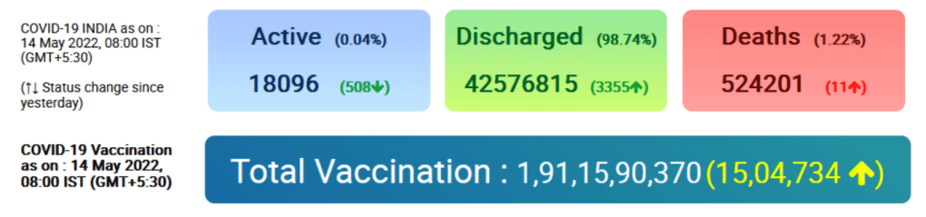 Government of India – Press Information Bureau Latest Press Releases COVID – 19 Vaccination Update – Day 484 :: India’s cumulative vaccination coverage crosses 191.30 Crore :: More than 13 lakh Vaccine doses administered today till 7 pm Posted On: 14 MAY 2022 9:22PM by PIB Delhi