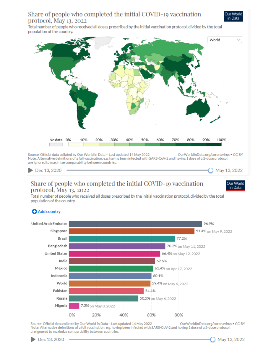 Our World in Data Coronavirus (COVID-19) Vaccinations[Accessed 14 May 2022] :: 65.4% of the world population has received at least one dose of a COVID-19 vaccine. :: 11.65 billion doses have been administered globally, and 6.45 million are now administered each day. :: Only 15.7% of people in low-income countries have received at least one dose.