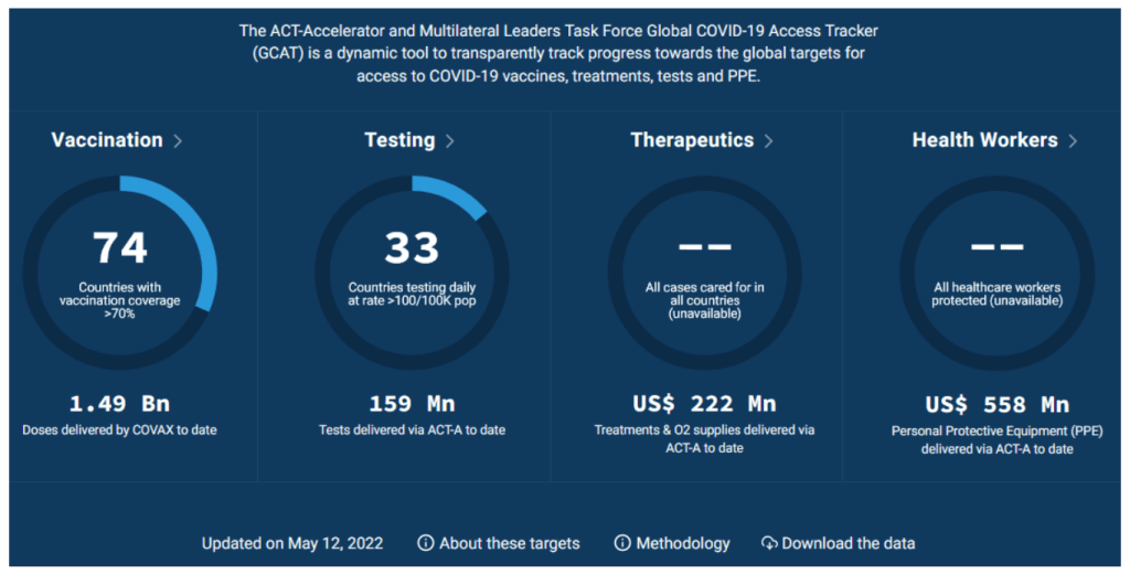 COVID-19 Global Targets and Progress Tracker – IMF The COVID-19 Global Targets and Progress Tracker presents a consolidated view of the progress towards global COVID-19 targets, barriers in access to COVID-19 tools, and delivery of donor pledges.