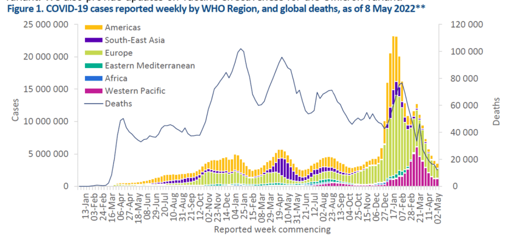 Weekly epidemiological update on COVID-19 – 11 May 2022 Overview Globally, the number of new COVID-19 cases and deaths has continued to decline since the end of March 2022. During the week of 2 through 8 May 2022, over 3.5 million cases and over 12 000 deaths were reported, decreases of 12% and 25% respectively, as compared to the previous week. However, an increase in the number of new weekly cases was reported from the Region of the Americas (+14%) and the African Region (+12%) and an increase in the number of weekly deaths was reported from the African Region (+84%). As of 8 May 2022, over 514 million confirmed cases and over six million deaths have been reported globally. In this edition, we provide an update on the geographic distribution of circulating SARS-CoV-2 variants of concern (VOCs), including the prevalence and summary of current evidence of the Omicron variant. We also provide updates on vaccine effectiveness for the Omicron variant.